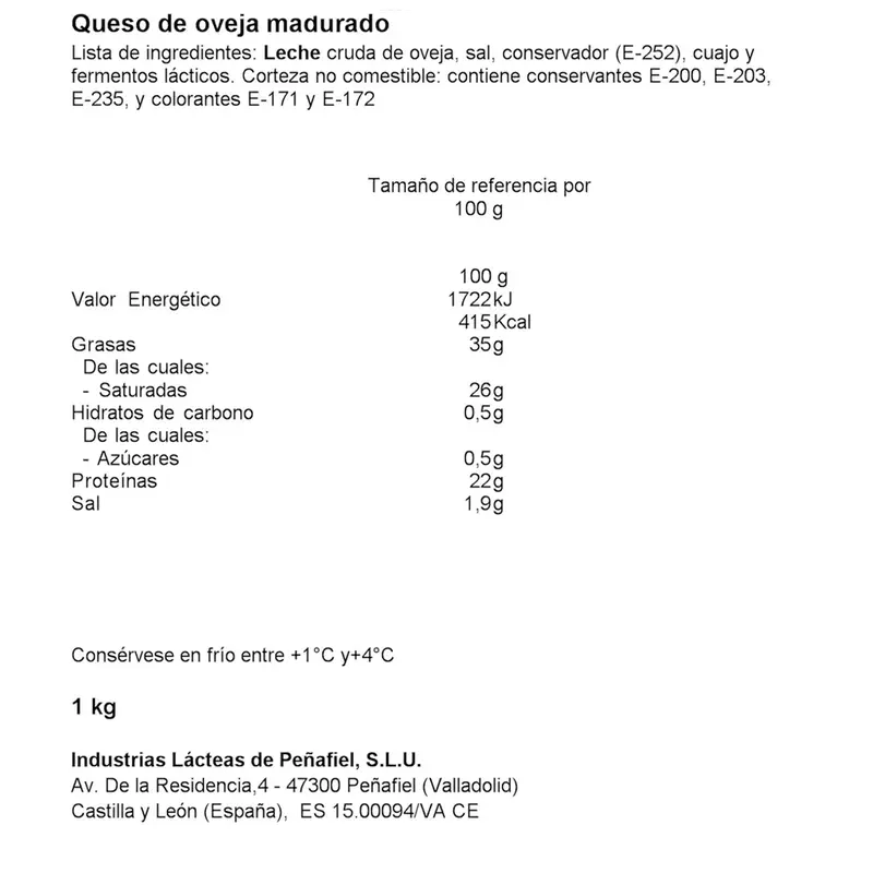 • Ingredientes: Leche de oveja, Sal, Conservador E- 252, Cuajo de origen animal (cordero), Fermentos lácticos.